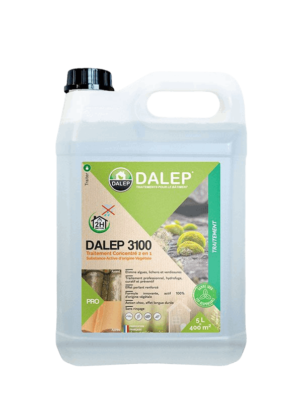 Dalep 3100 est un traitement professionnel concentré 2 en 1, il est composé d'une substance active d'origine végétale. Il est utilisé par les professionnels du bâtiment pour éliminer les algues, les lichens et les verdissures.